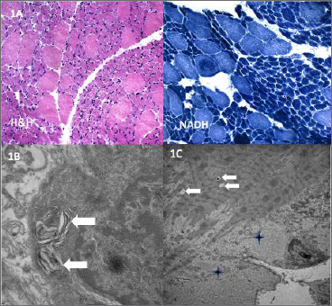 Figure 1. (A). Muscle biopsy. H&E and NADH staining show numerous hypotrophic type 1 fibers (dark blue on NADH) surrounding hypertrophic or normal type 2 fibers (light blue on NADH), suggestive of a fiber-type disproportion myopathy. No central nuclei, cores, fiber degeneration, or increased endomysial connective tissue were observed. (B-C). Ultrastructural analysis. Myelinoid-like elements composed of membranous structures are visible in the subsarcolemmal region (white arrows) (B). A few vacuoles are present in the intermyofibrillar space (white arrows), along with nonspecific granulofilamentous material in the subsarcolemmal region (crosses) (C).