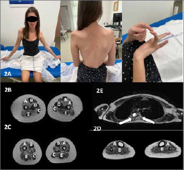 Figure 2. (A). Neurological examination. Diffuse muscle atrophy is evident, along with scapula alata, scoliosis, and distal joint hyperlaxity. (B-E). Muscle MRI (T1-weighted images). Thigh sections (B-C) show hyperintense signal consistent with fatty replacement of the quadriceps (A), with relative sparing of the rectus femoris (B), gracilis (C), adductors (D), and semitendinosus (E) muscles. The leg section (D) demonstrates relatively preserved musculature compared to the thigh, with mild hyperintensity of the tibialis anterior (A) and sparing of the soleus (B). Fatty infiltration of the paraspinal muscles is also visible (arrows) (E).