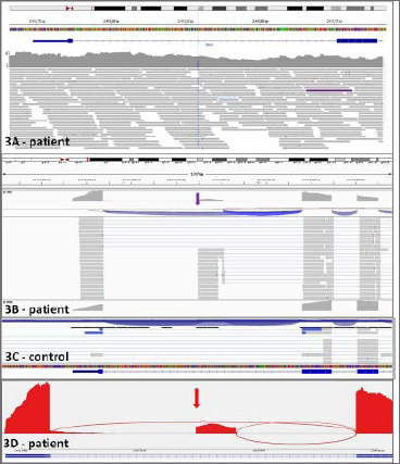 Eventually, trio-based whole-genome sequencing, including both parents, identified a novel de novo heterozygous deep intronic variant (NM_000257.4:c.5791-421C > G) within intron 39 of the MYH7 gene (Fig. 3A). Transcriptional analysis performed on a muscle biopsy (using Illumina polyA selection kit) confirmed an abnormal splicing event with the in-frame insertion of a novel 117 bp exon between exons 39 and 40. This novel exon was not present in healthy control muscle and was located at genomic coordinates Chr14(GRCh38):g.23413293-23413409 (Fig. 3B-C-D).