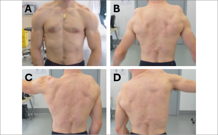 Figure 1. Patient at first evaluation. (A) Anterior view of the upper body; (B) posterior view during bilateral arm abduction; (C) left arm abduction; (D) right arm abduction. Written permission to publish the photos was obtained from the patient.