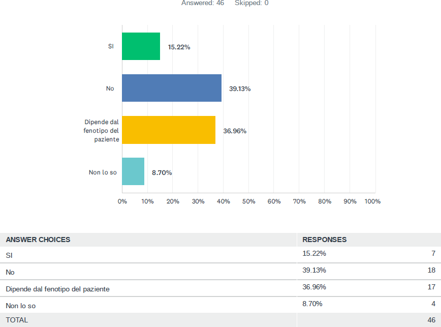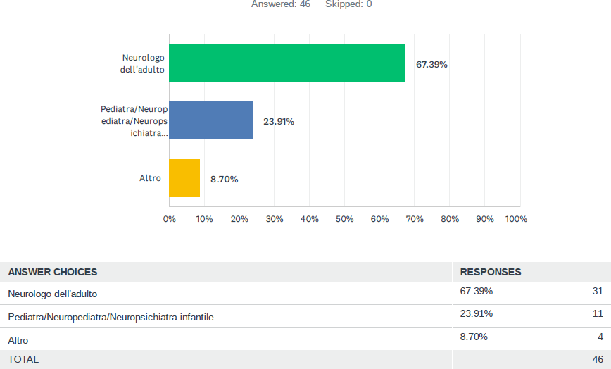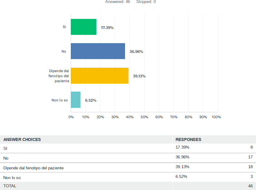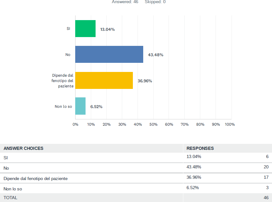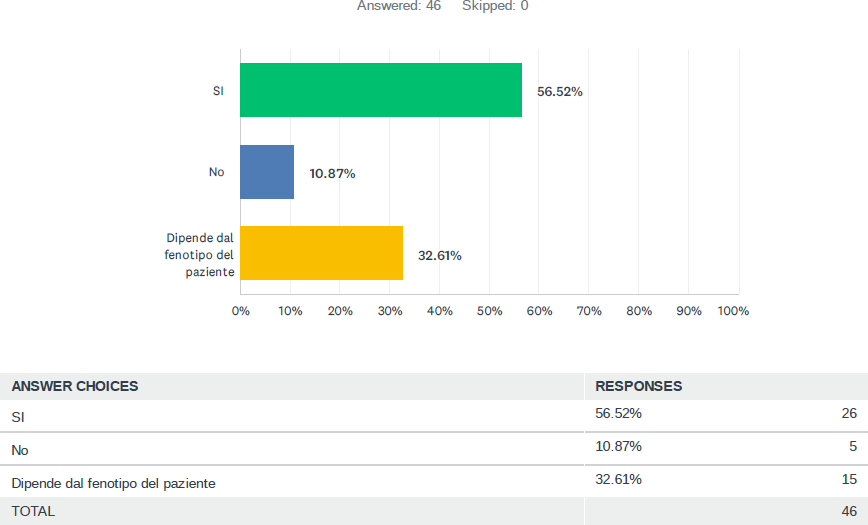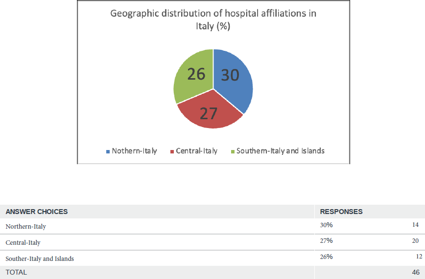 Out of approximately 400 AIM members invited to participate, 46 clinicians (about 12%) fully completed the survey. While some respondents were not affiliated with the AIM clinical centers, the sample nonetheless included representatives from 30 of the 34 AIM centers (89%). This distribution supports the representativeness of the findings across the Italian network of clinicians with expertise in neuromuscular diseases. The Table I summarizes the results (available in more detail as supplementary file).