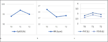 Figure 1. Trend of SpO2 (a), RR (b), FVC and FEV1 (c) values during sailing and at 6 months, compared to baseline.